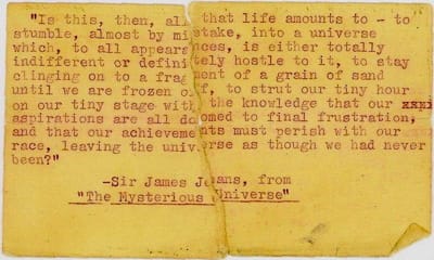 Sometime between my 10th and 12th year, I typed a question on a white index card in red ink, typos and all, and I still carry that card in my wallet to this day, decades later. The card is ripped in half, because sometime during my thirties, I believed that I had the answer. But after dropping the pieces into a waste basket, a doubt crossed my mind, and I retrieved them reluctantly. It was a question that was posed by the physicist, Sir James Jeans:1
